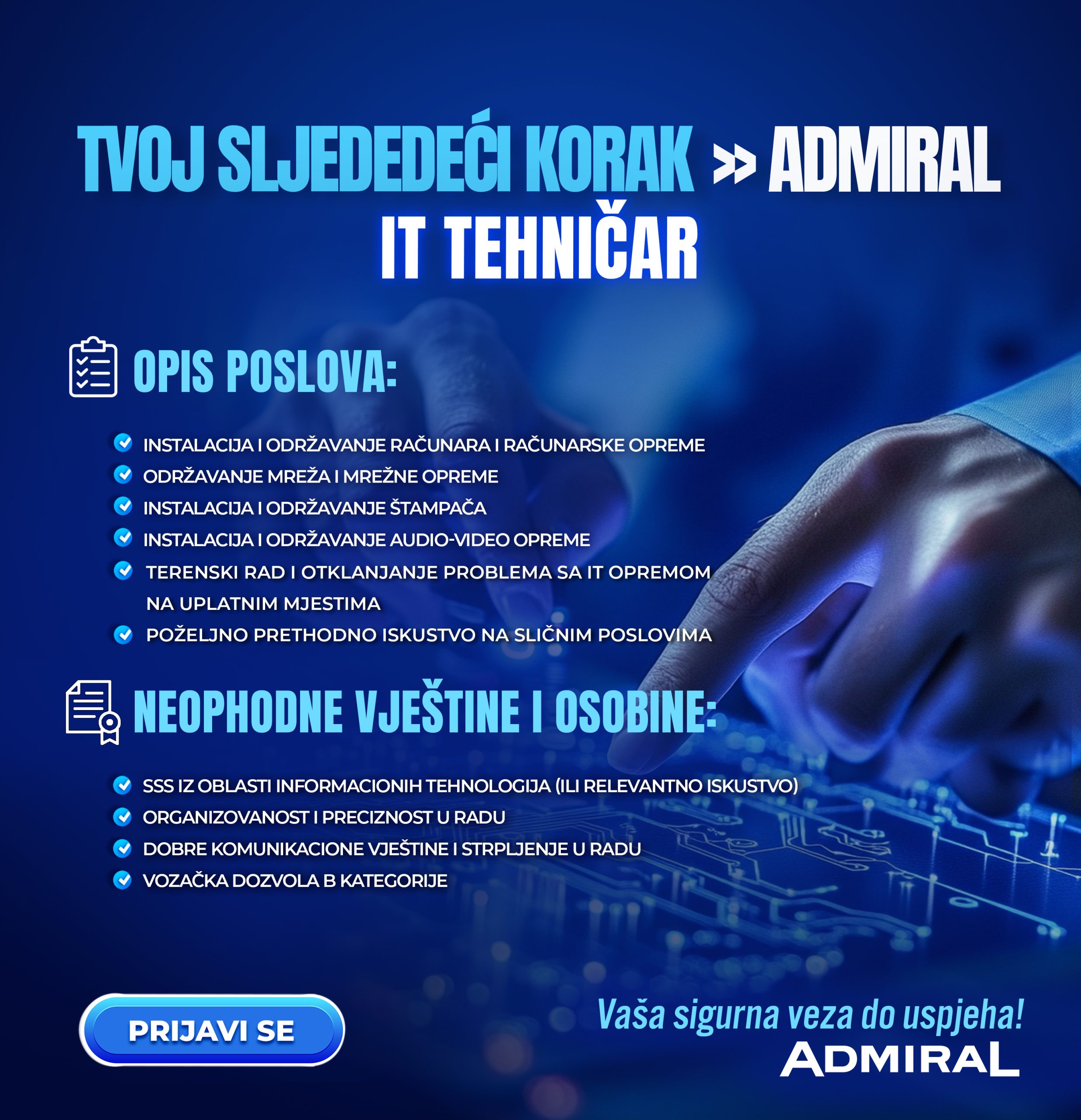 Ukoliko se prijavljujete putem e-maila ili poštom, uz prijavu obavezno navedite da se prijavljujete na posao koji ste pronašli na portalu www.banjaluka.com.
