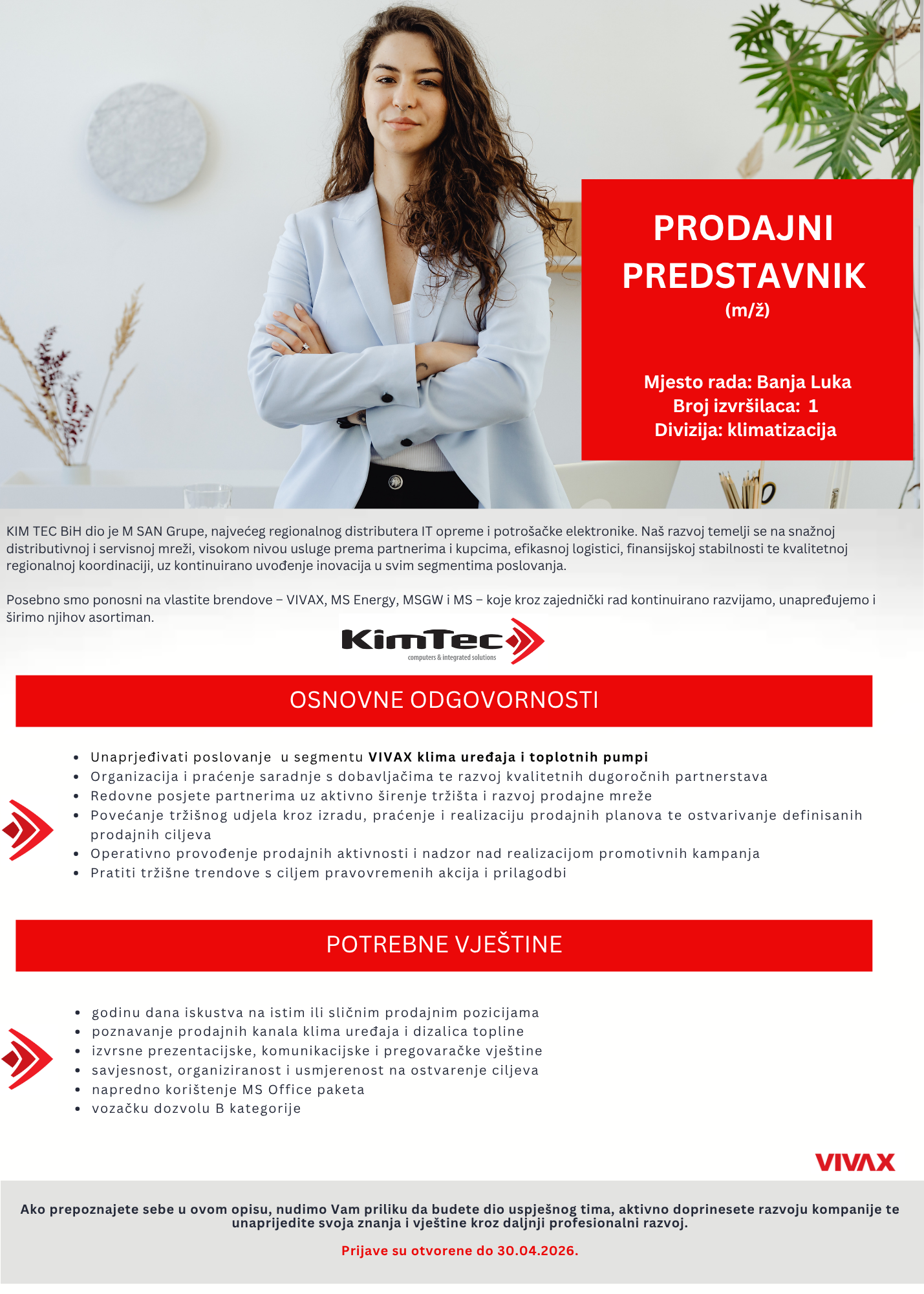 Ukoliko se prijavljujete putem e-maila ili poštom, uz prijavu obavezno navedite da se prijavljujete na posao koji ste pronašli na portalu www.banjaluka.com.